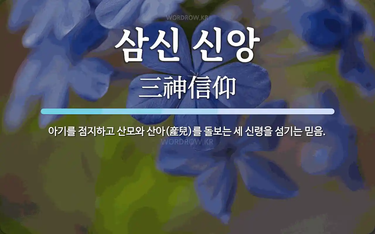 - 명칭의 유래: '삼신'의 '삼'은 숫자 3이 아니라, 태를 의미하는 '삼' 혹은 살아나다는 뜻의 **'살다'**에서 유래했다는 설이 유력합니다. 보통 인자한 할머니의 모습으로 여겨져 '삼신할미'라 불립니다.