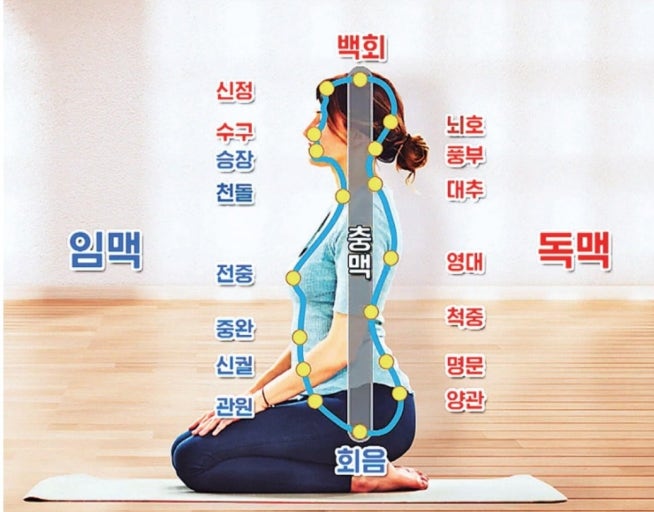 • 시작: 독맥과 마찬가지로 회음(항문과 생식기 사이)에서 시작합니다.